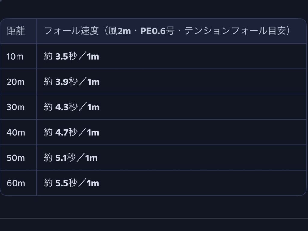 条件は3秒/1mでフォールするエギ。PE0.6号ライン。風速2m。