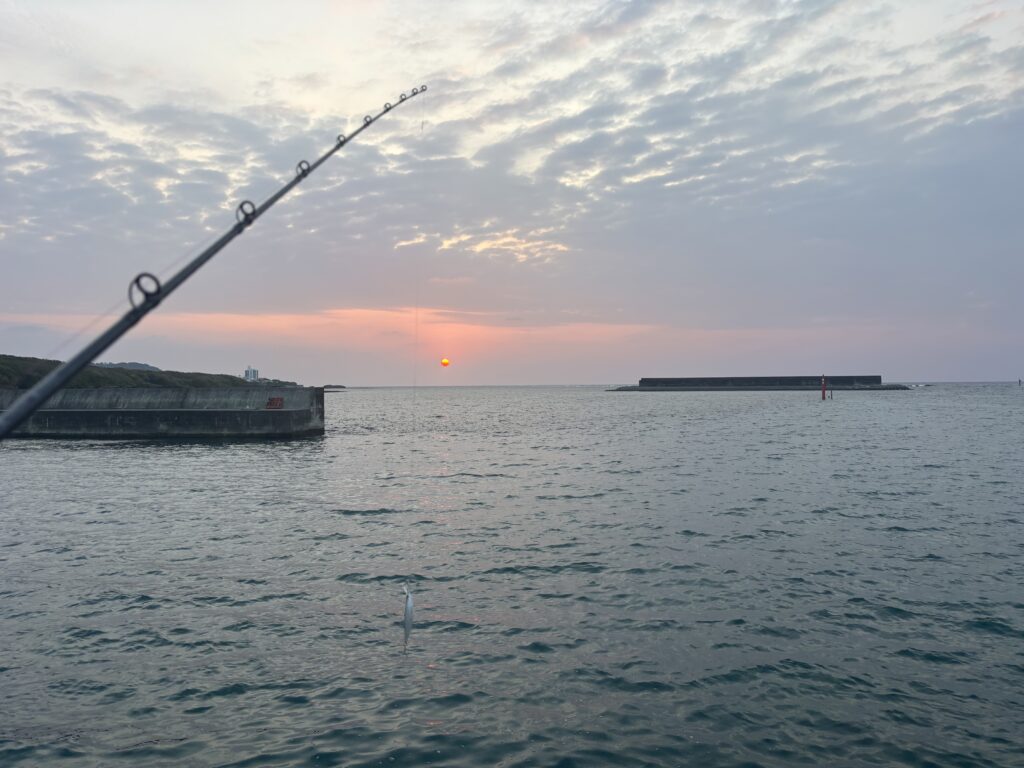 チヌ狙いが多いですが、中にはエギングの方もいました。話を聞くと、今でも朝方に港内を群れで移動するアオリイカがいるそうです。エギに対する反応もよく、こちらから見える状態でも素極的にアタックしてくるそうです。サイズは500gくらい。まだまだエギングができそうですね!